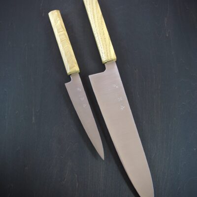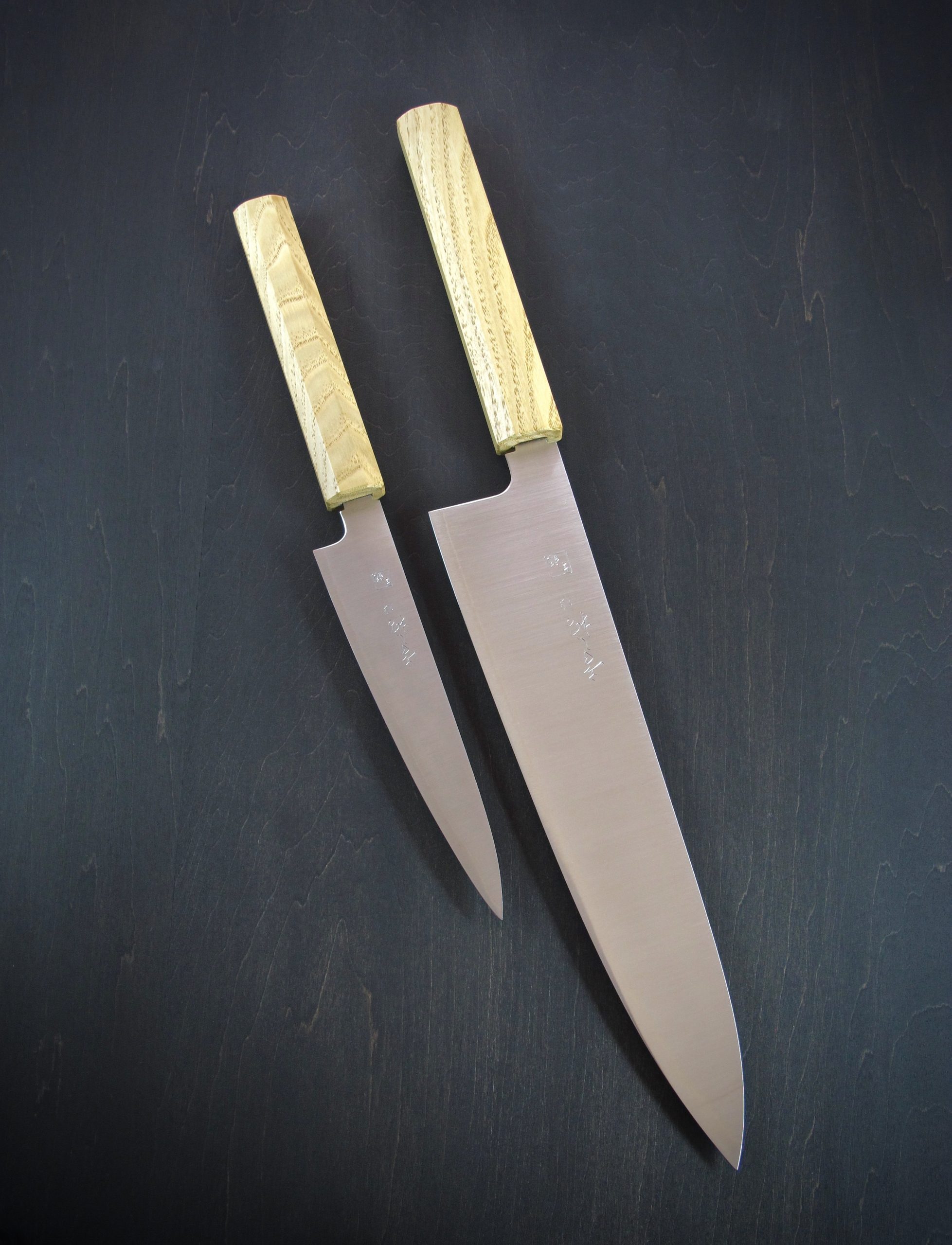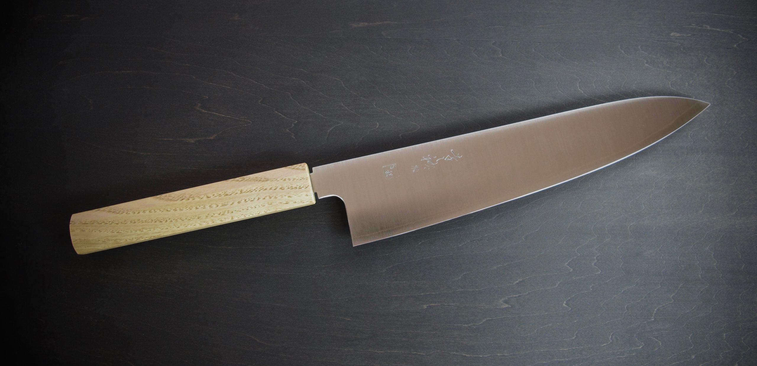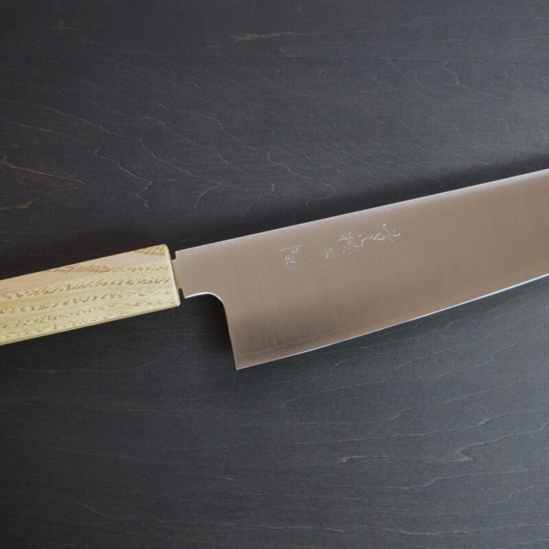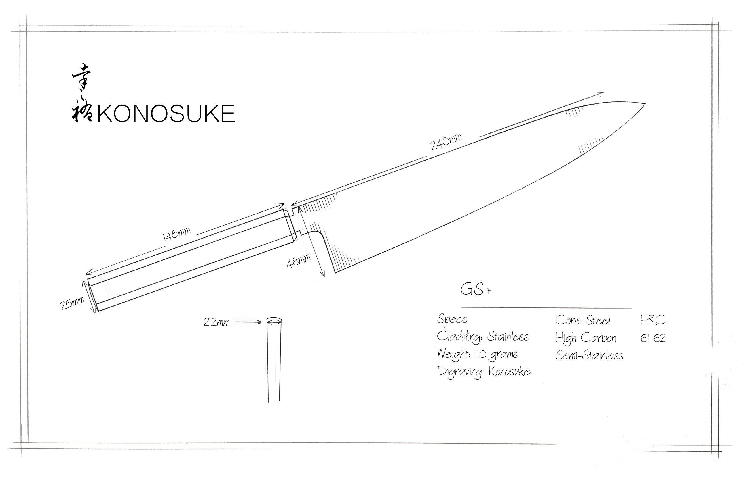 With the latest update to the line, the GS+ is now harder, offering excellent edge taking, as well as a longer edge life, meaning you can go longer between sharpenings. The rounded spine and choil, along with engraved kanji, complete an elegant package, making these knives comfortable in your hand no matter how long the job lasts.