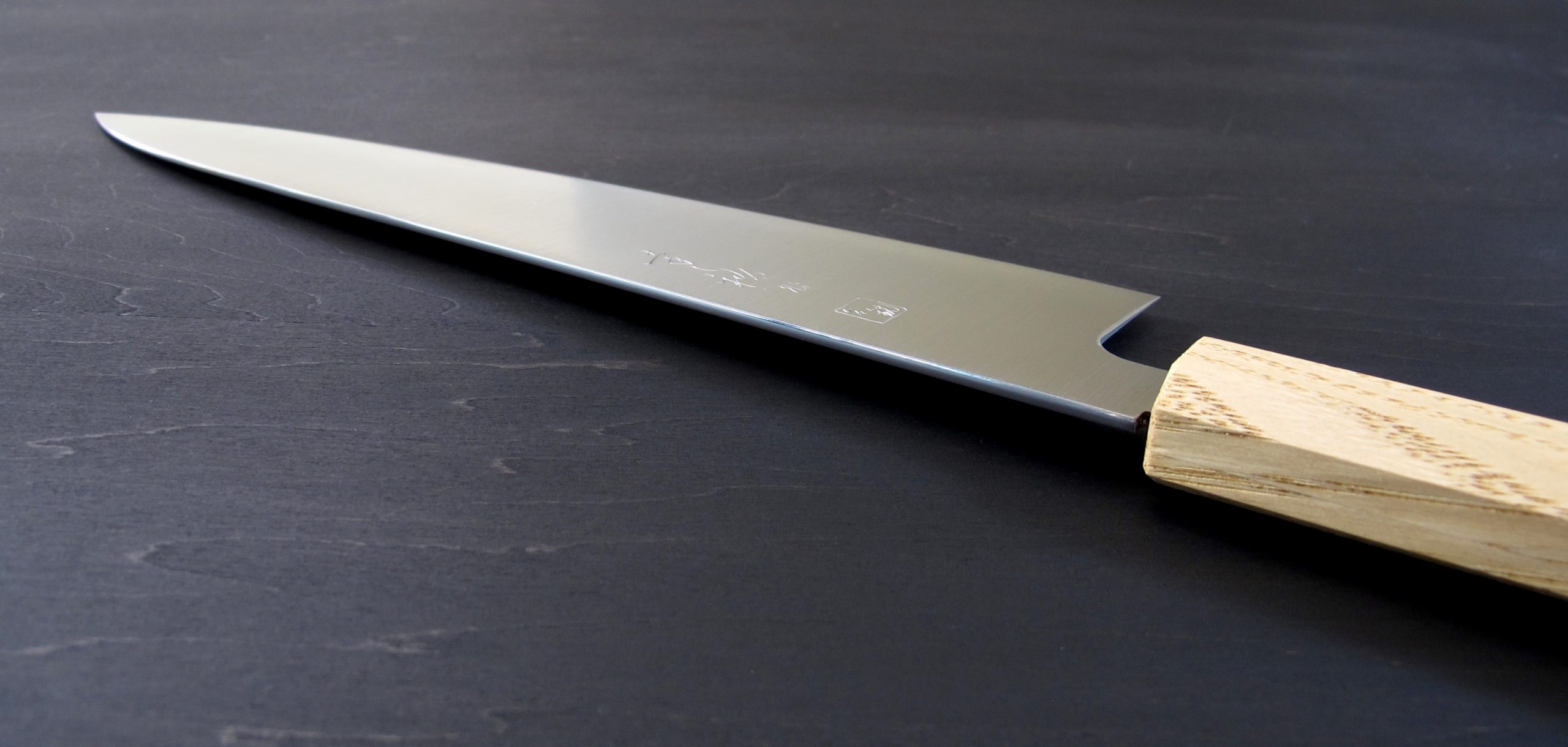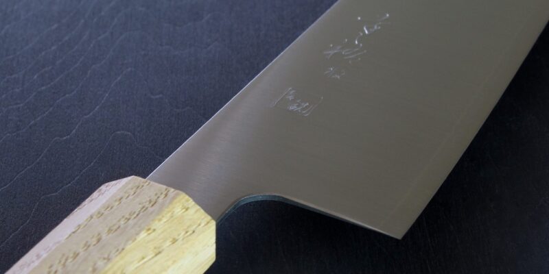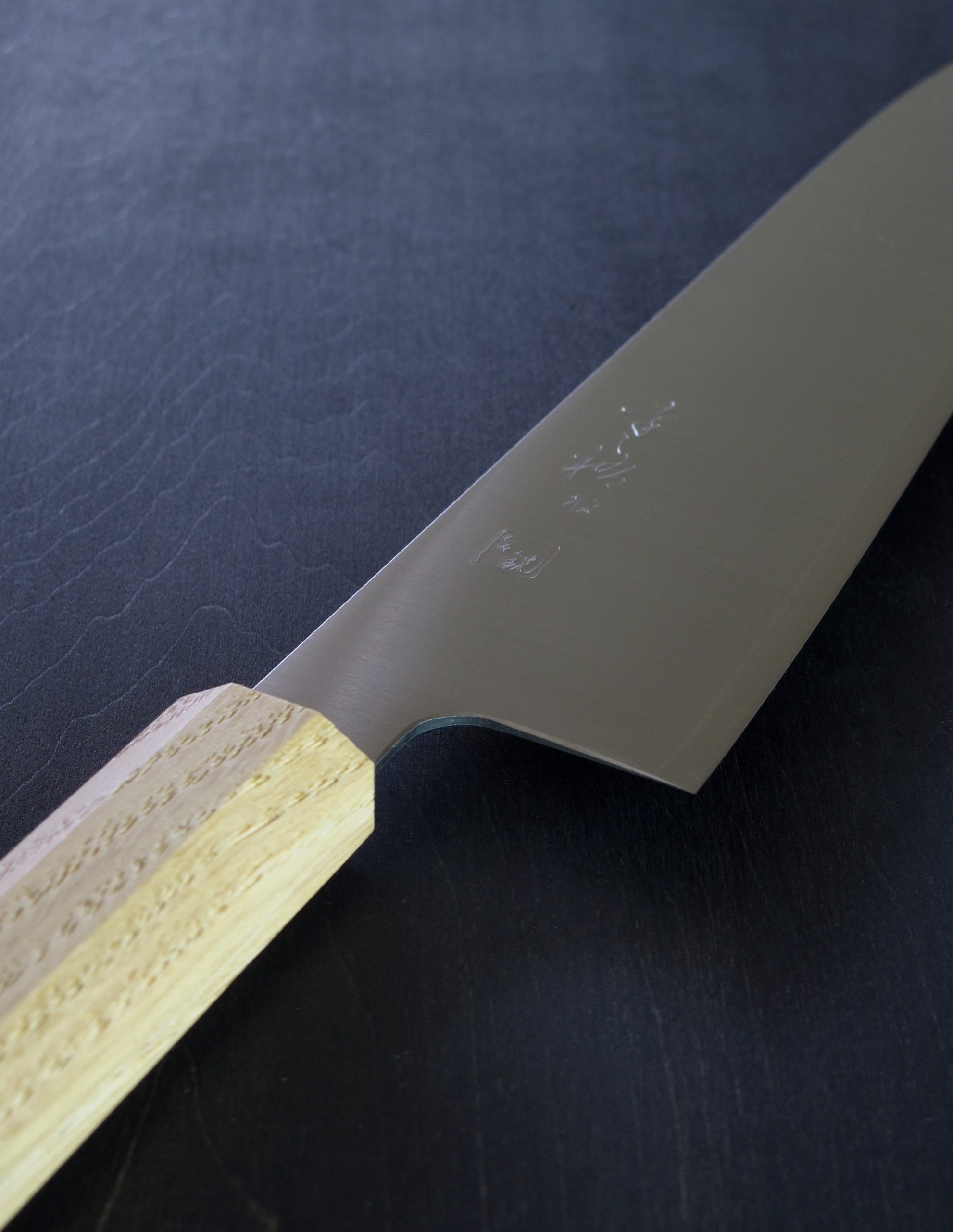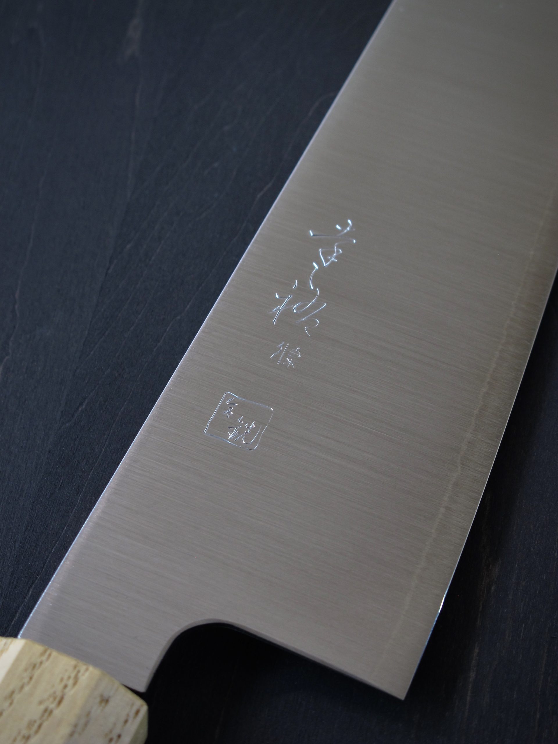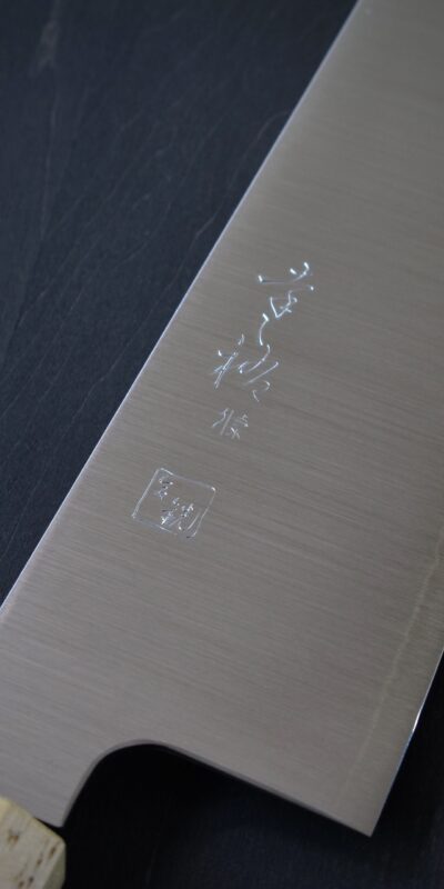 当初の"GS"から改良を加えて硬度を高め、切れ味・長切れともに品質が向上したので、以前のように頻繁に研ぐ必要がなくなりました。峰とアゴは面取りをし、漢字が刻印されたスタイルです。