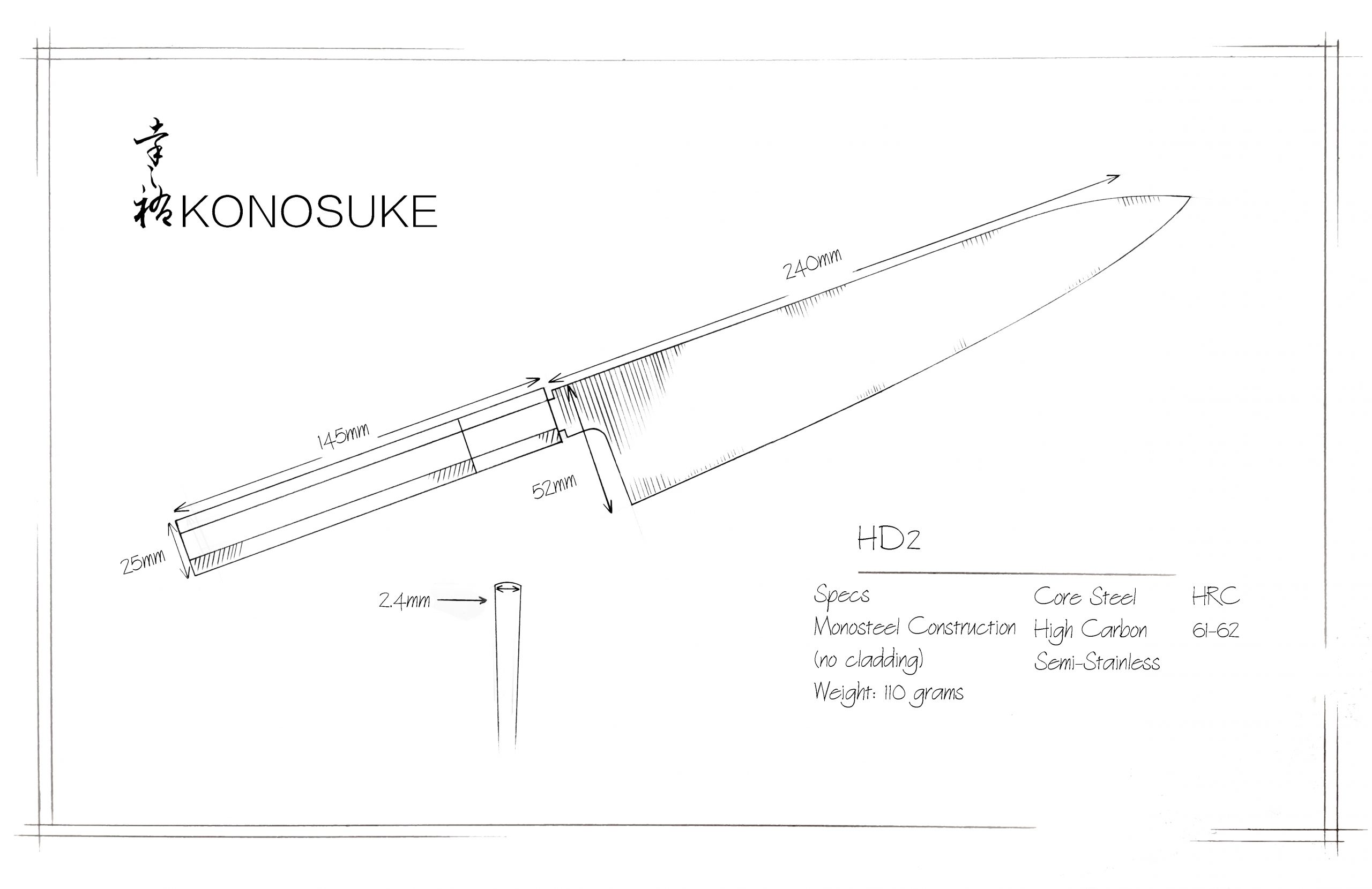 One of Konosuke's longest in-production-series, the HD2 is an excellent choice from customers new to Japanese knives, to Professionals in demanding kitchen settings alike. They come sharpened straight from the craftsmen and are ready to work from the moment you pick them up.