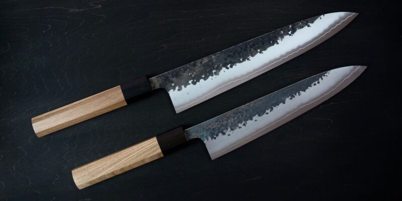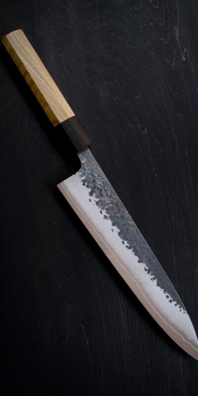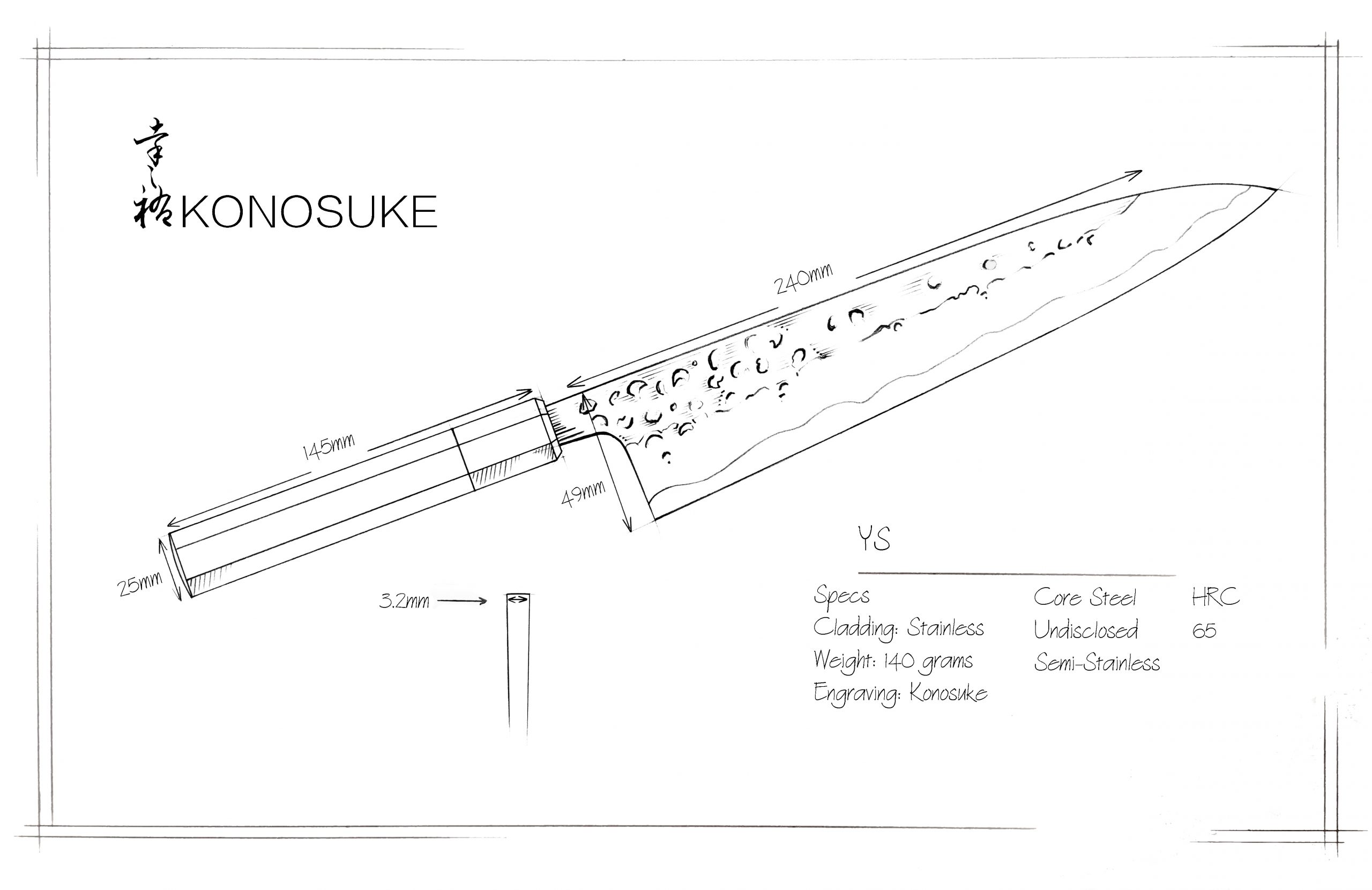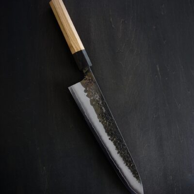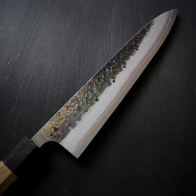 From the beautiful kurouchi tsuchime stainless cladding, to the impeccably forged Semi-Stainless core, or to the deceptively-elegant profile, the YS knives offer excellent performance with beautiful design all in one package. Forged and sharpened in Sanjo, these knives come closer to their advertised length compared to their Sakai counterparts, with 240mm gyuto usually being 240-245mm on edge.
