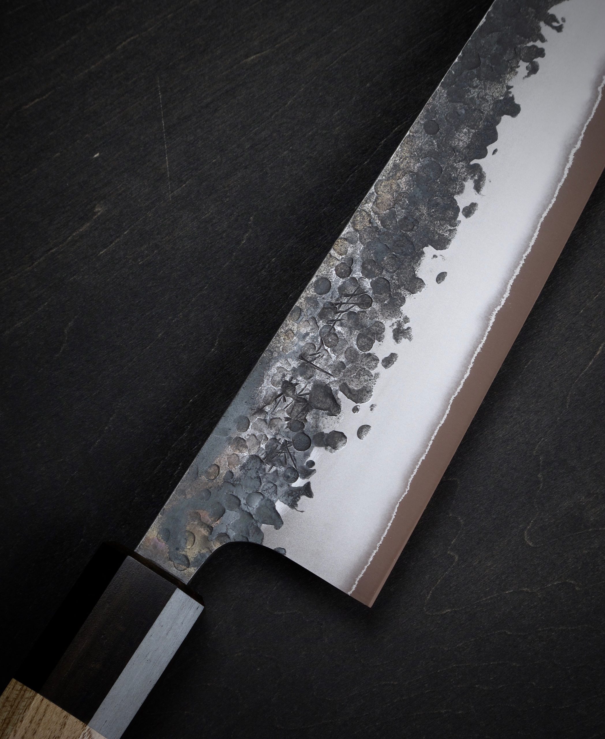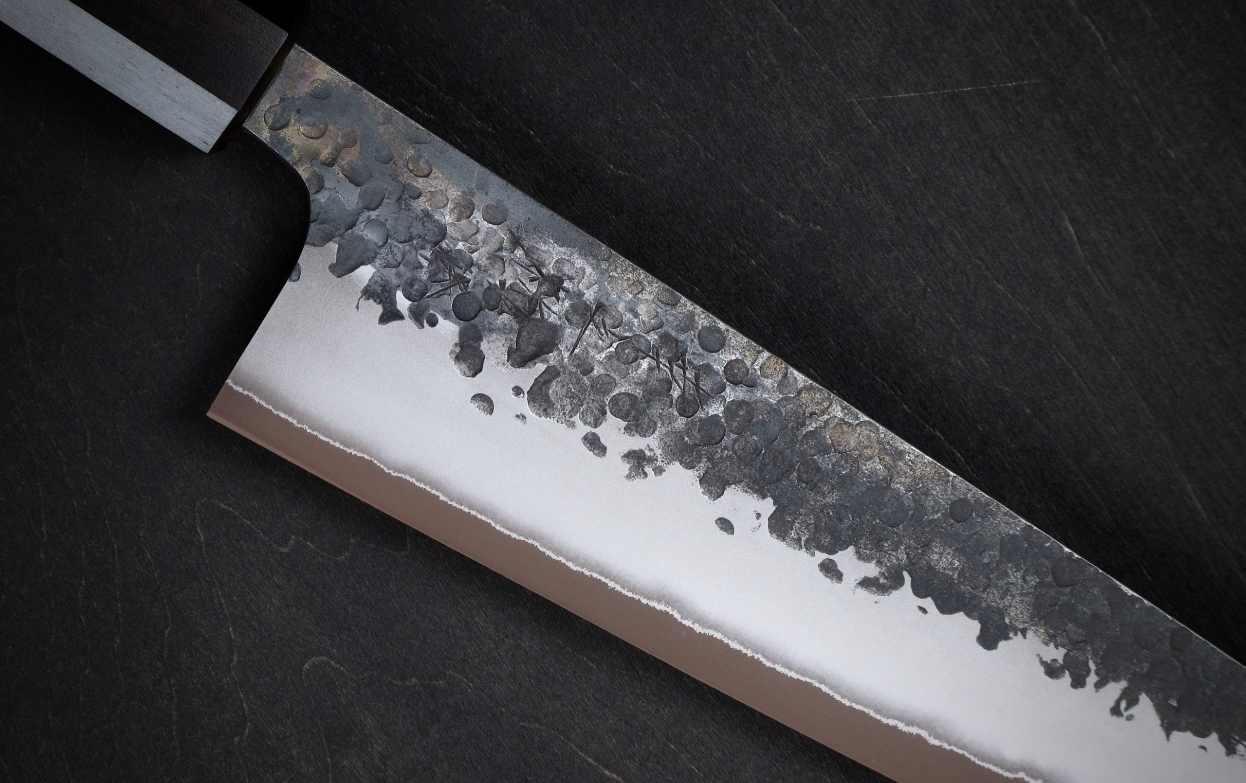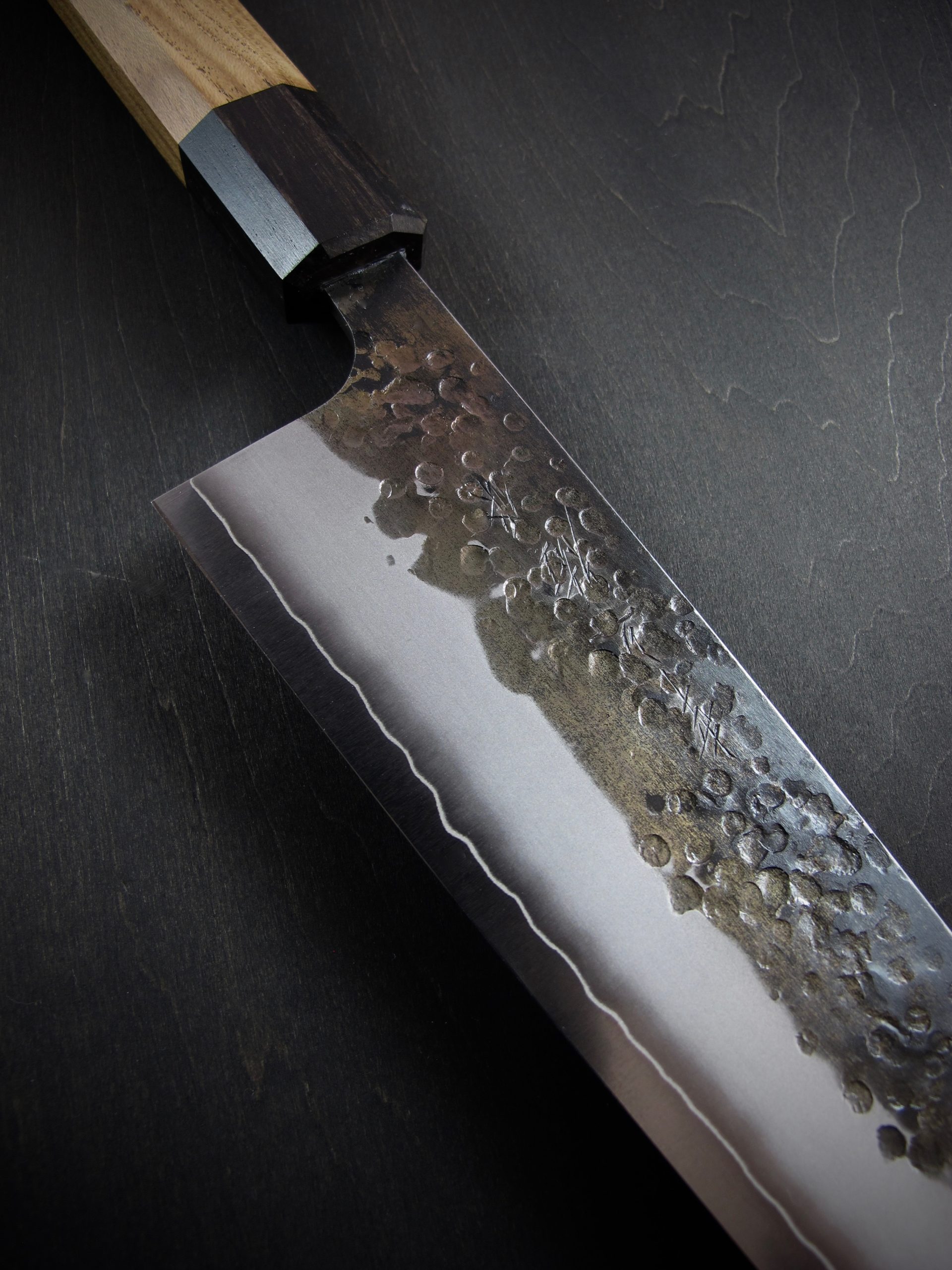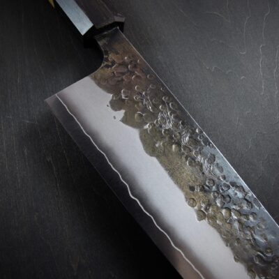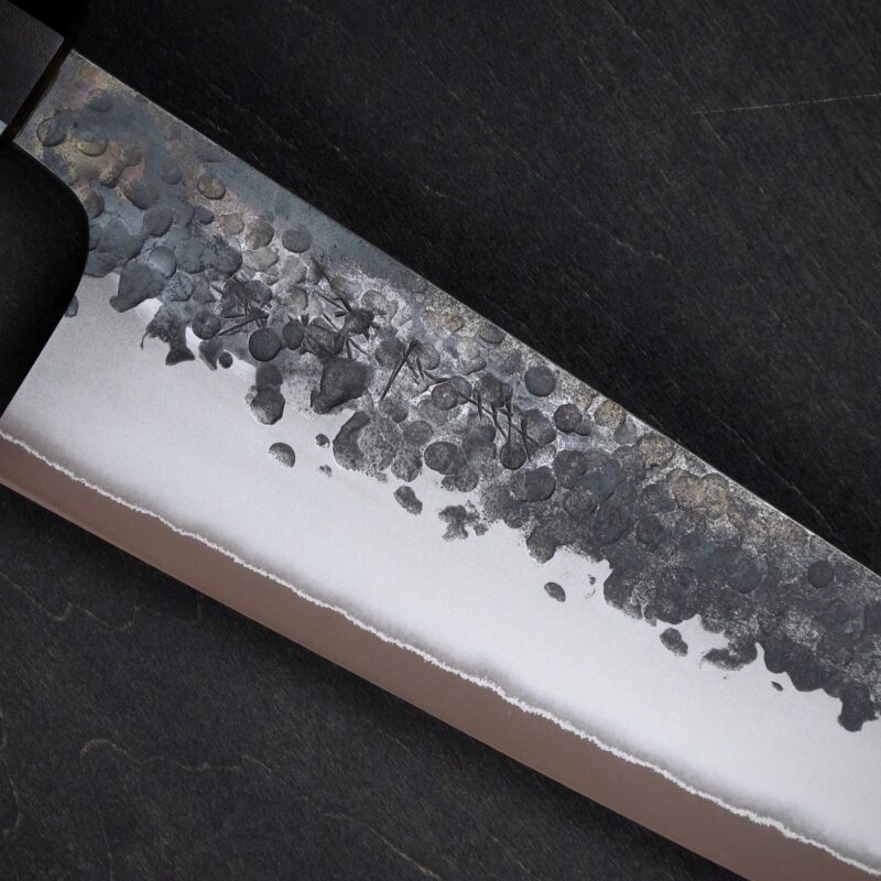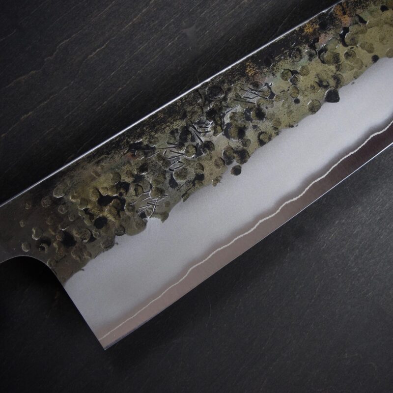 黒打・槌目・つや消し仕上げ・地境(じざかい)の線。これらの特徴的な仕上げにより、単に切るための道具ではなく、作品とも呼べるような包丁を目指しました。
