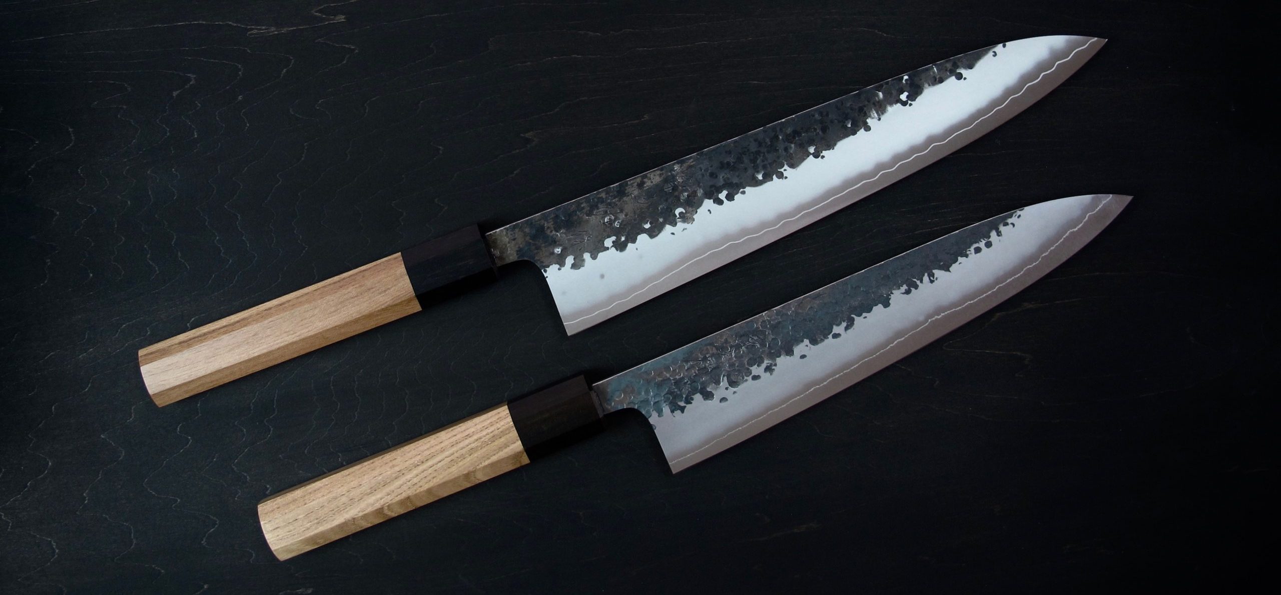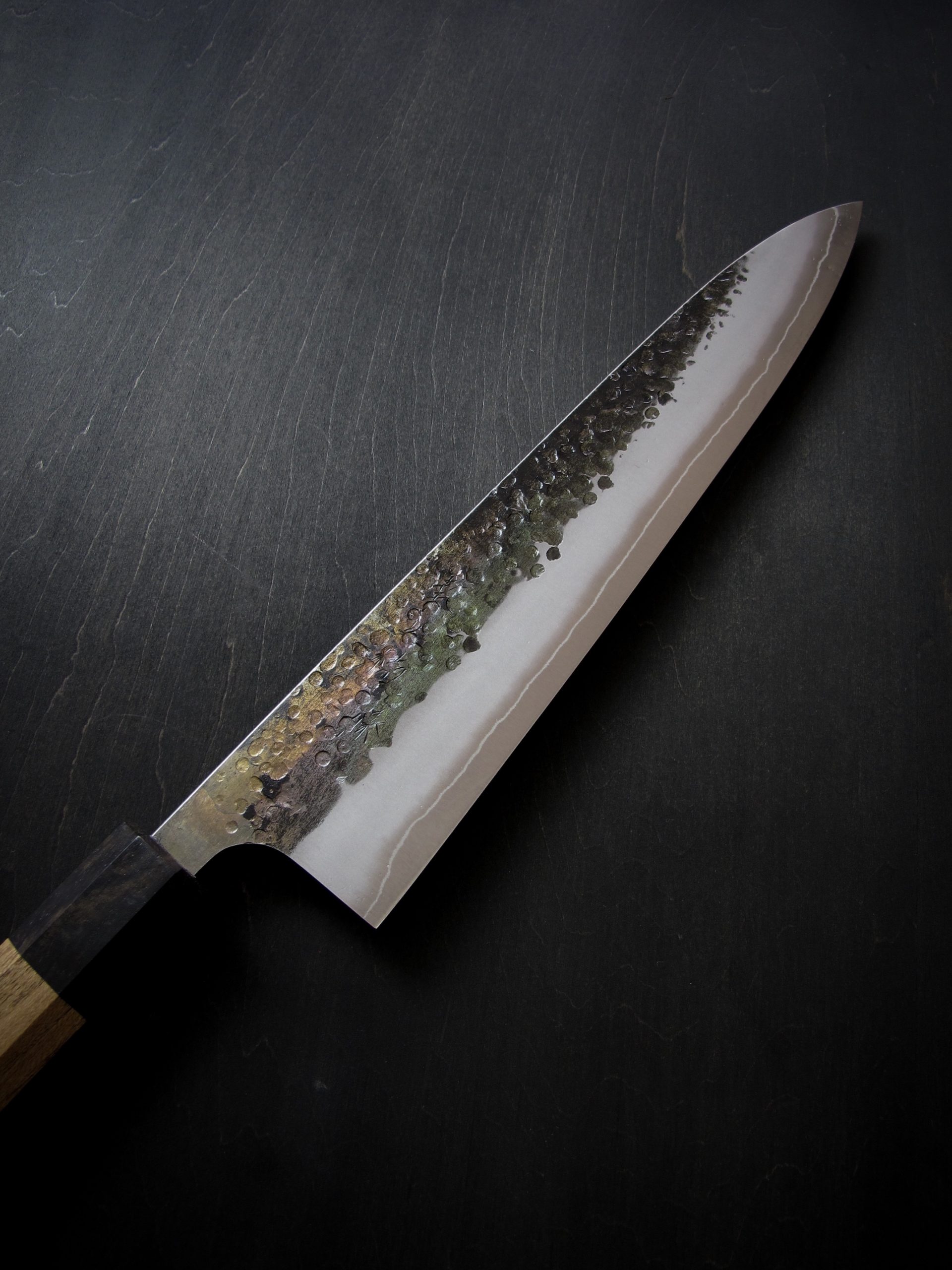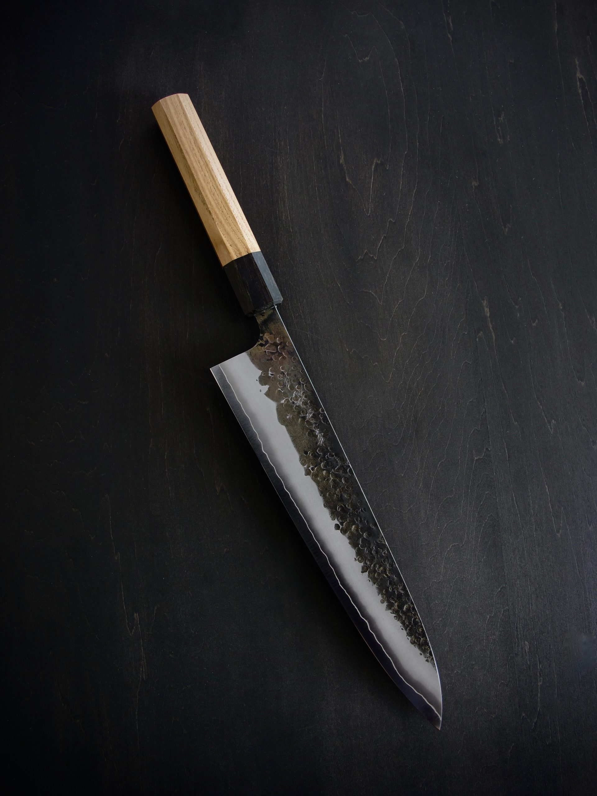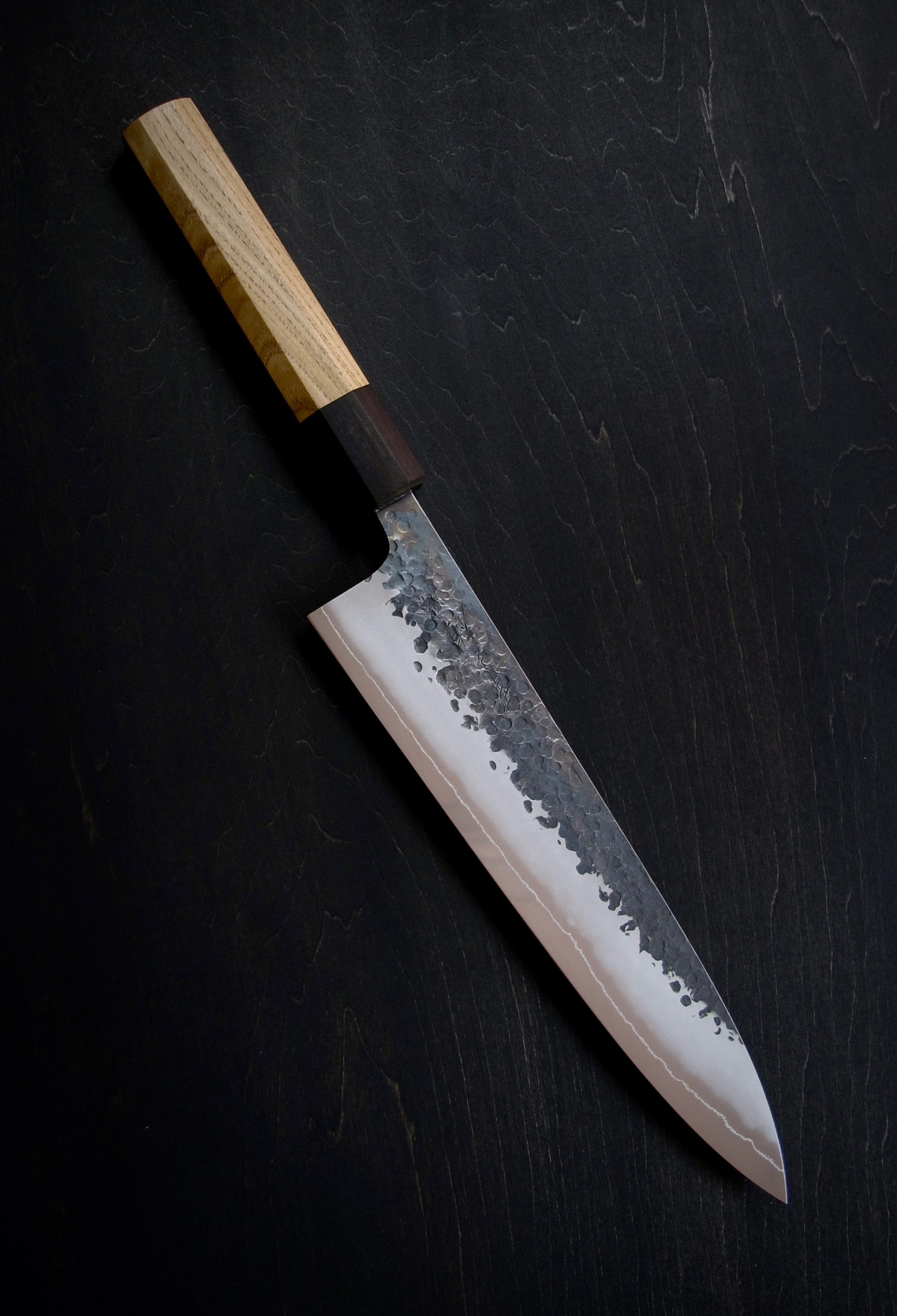 黒打・槌目・つや消し仕上げ・地境(じざかい)の線。これらの特徴的な仕上げにより、単に切るための道具ではなく、作品とも呼べるような包丁を目指しました。
